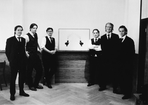 Composed in two lines around a marble mantle, six members of the Hermes Fraternity in Rotterdam flank a framed airbrush drawing (gifted by the artist)of two candles in the form of mirrored silhouettes of a bust of Hermes of Praxiteles. Smoke rises from the recently extinguished wicks to form an arch. This composition was photographed by the artist and reproduced in silkscreen on an editioned poster, wheat-pasted onto the wall of the gallery.