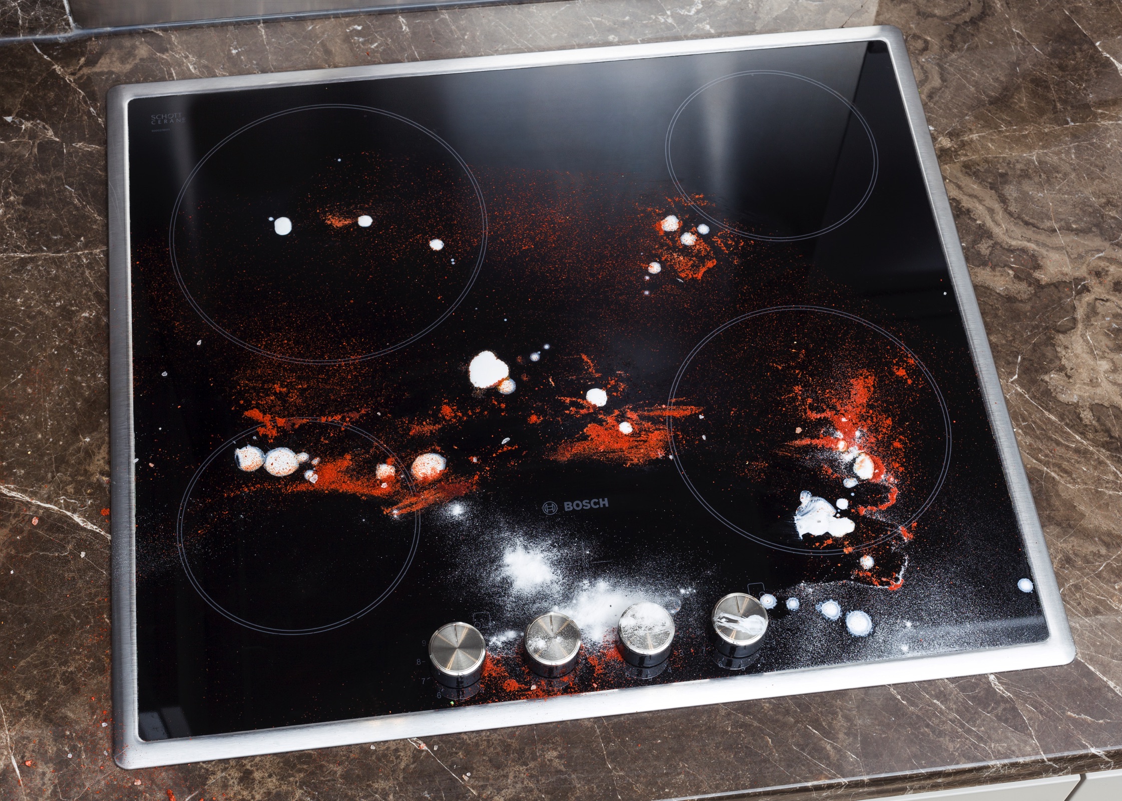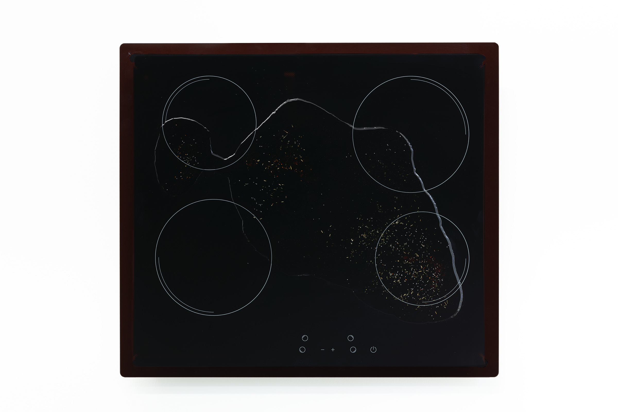 Resinous slicks fix herbs and spices on two pairs and one individual generic model of ceramic induction hob, hung vertically.