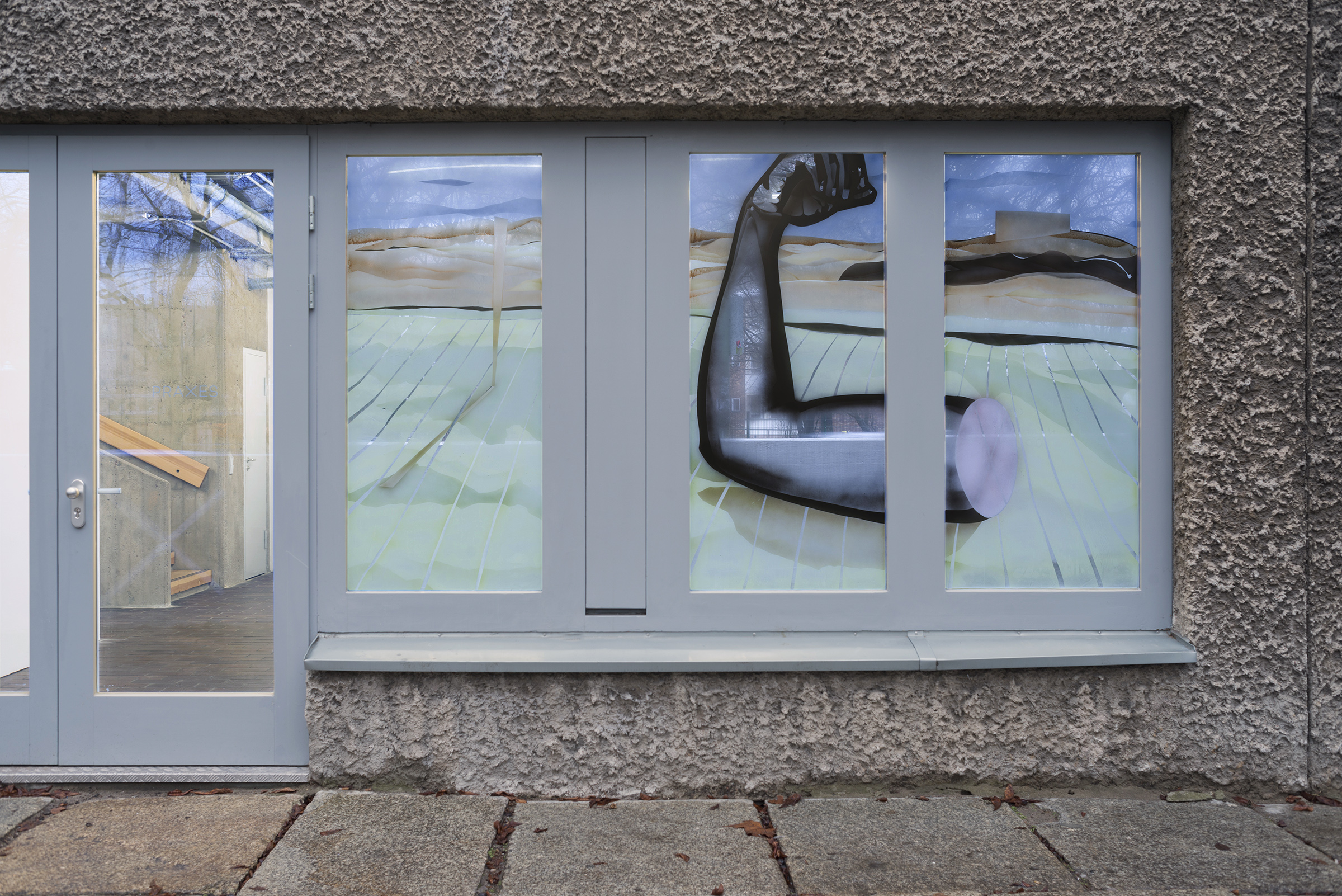 Magnetic Promenade, airbrush on gallery windows ('Hat, Hat, Hat, Uniform', Praxes, 2015, solo)